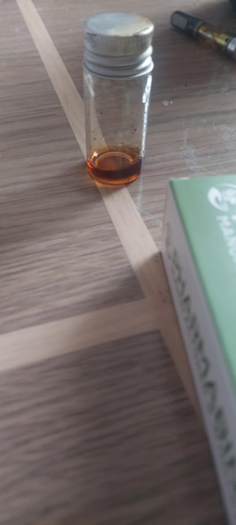 Amber & Oxidation: Na załączonych zdjęciach widać autentyczny kolor destylatu C6 (tego, którego jest 15%). Często pytacie o kolor destylatu. Głęboka, bursztynowa barwa (Amber) oraz naturalna zmiana koloru przy górnej krawędzi (oksydacja) to w tym przypadku jedne z najlepszych wyznaczników jakości. Oksydacja świadczy o obecności czystych, aktywnych związków, które reagują z minimalną ilością tlenu w kartridżu. To dowód na to, że nie używamy sztucznych barwników ani wybielaczy – to "żywy", wysoce stężony produkt, który zachowuje swoje właściwości dzięki stabilnej budowie molekularnej.